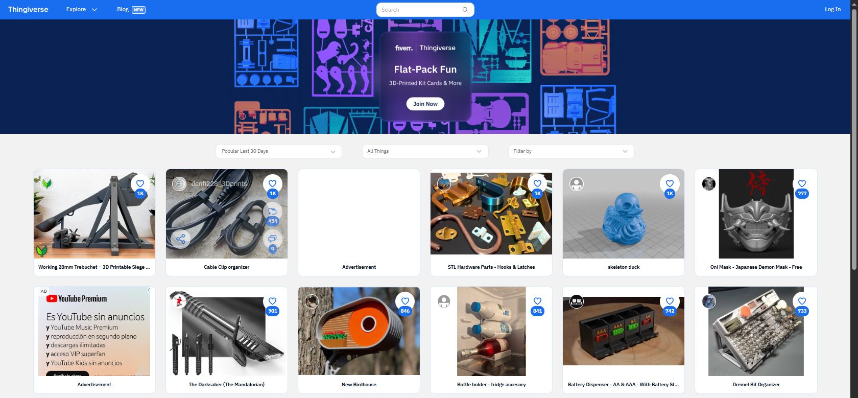Me puse a ver un poco de objetos en thingiverse para Impresión 3D, que tuve una buena época de hacer impresiones el año pasado que compre una impresora, de momento la web se ve así