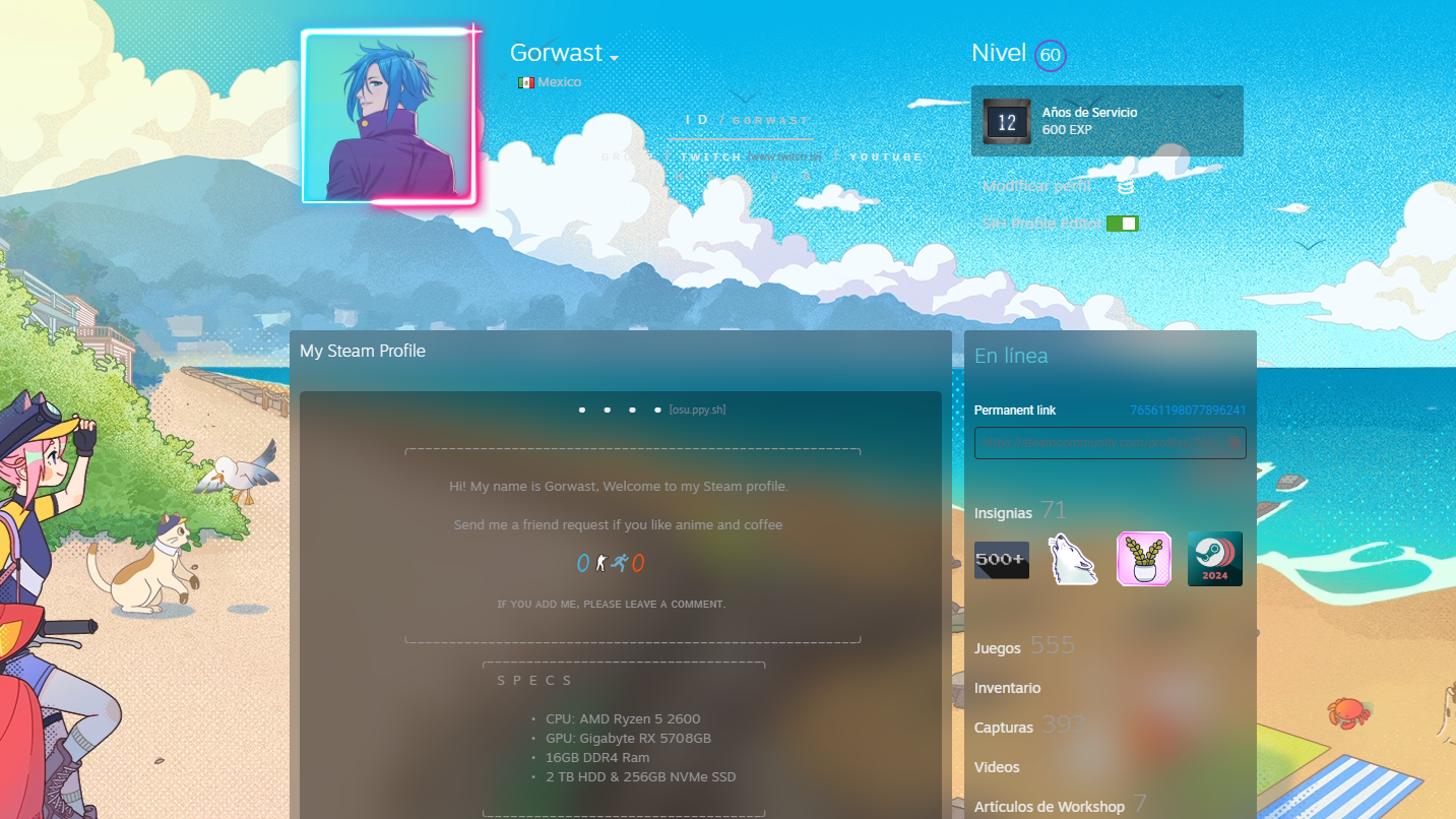 Mi perfil de Steam es el siguiente gorwast, llevo comprando juegos en esa plataforma desde hace mas de 12 años y es la plataforma en la que suelo jugar mas